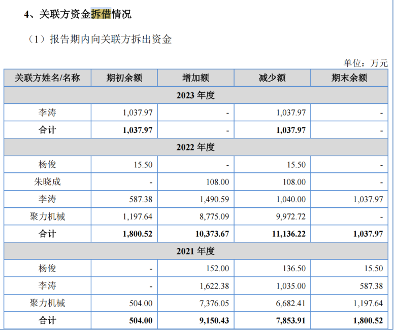除了上述现金分红外,酉立智能还向实际控人以及法定代表人大量借出资金。从2021年至2023年(以下简称报告期),酉立智能向李涛、杨俊、朱晓成和聚力机械借出资金期初余额分别为504万元、1800.52万元和1037.97万元,期末余额分别为1800.52万元、1037.97万元和-。朱晓成直接持有酉立智能的股份占比为5.84%。