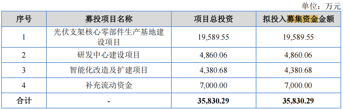 此次IPO,酉立智能计划募集资金3.58亿元,其中1.96亿元用于光伏支架核心零部件生产基地建设项目,0.49亿元用于研发中心建设项目,0.44亿元用于智能化改造及扩建项目,0.7万元用于补充流动资金。