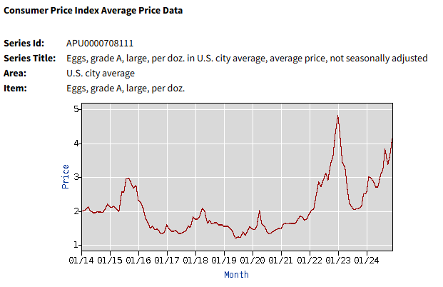 据美国劳工统计局的数据,2024年12月,美国城市A级大号鸡蛋平均价格为每打(12个)4.146美元。与之相比,2023年12月时仅为2.5美元左右。