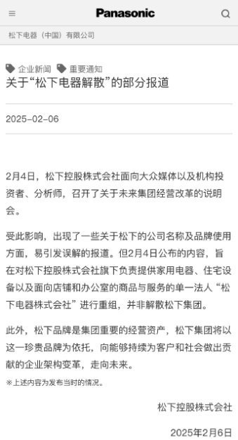 受此影响,出现了一些关于松下将出售或退出电视机业务、易引发误解的报道。但2月4日公布的内容,旨在对松下控股株式会社旗下负责提供家用电器、住宅设备以及面向店铺和办公室的商品与服务的单一法人“松下电器株式会社”进行重组,并非解散松下集团。
