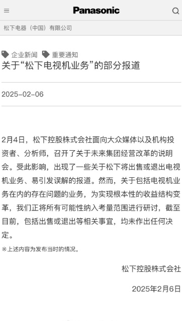 2月6日,@Panasonic松下中国微博账号先后发布《关于“松下电器解散”的部分报道》《关于“松下电视机业务”的部分报道》,否认解散松下集团。关于松下电视机业务的去留,“正将所有可能性纳入考量范围进行研讨”,只是目前尚未作出任何决定。