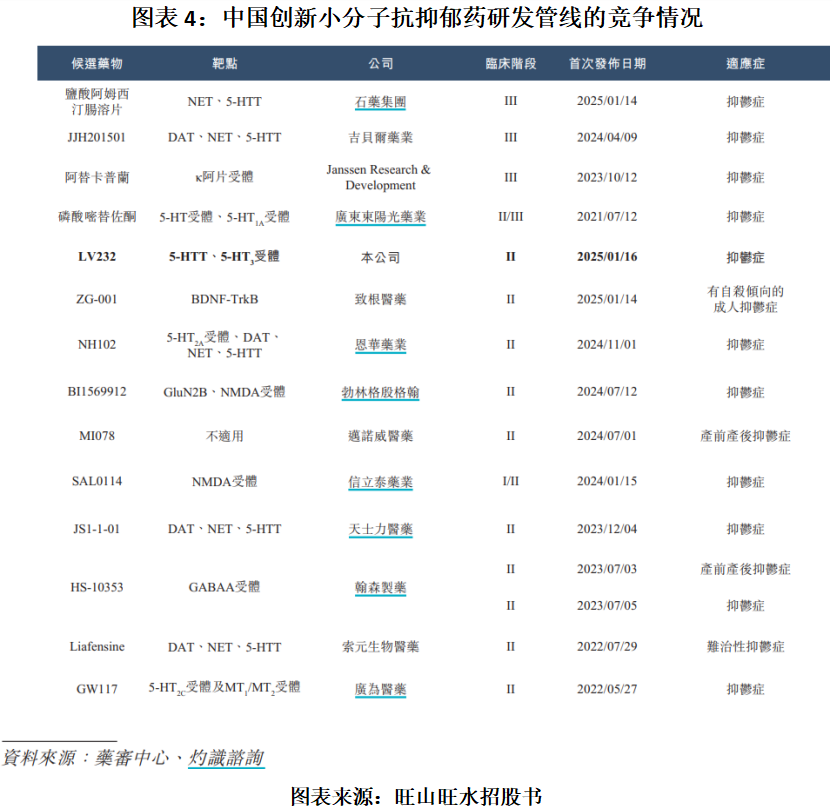 竞争格局方面,截至最后实际可行日期,已有24款创新小分子抗抑郁药在中国获批上市。此外,中国有14款创新小分子抗抑郁药正处于II期或更后期临床开发阶段。LV232是唯一专门靶向5-HTT及5-HT3受体的产品,处于II期临床阶段。相比之下,石药集团(01093.HK)等多家药企的产品已处于III期临床阶段,同样领先于LV232。