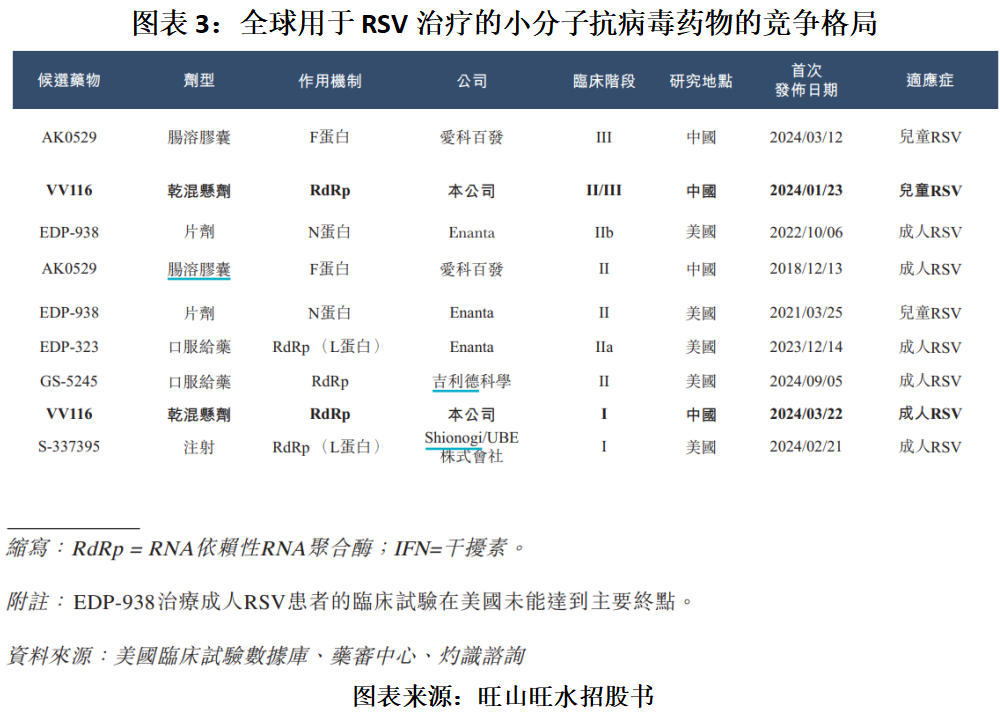 在中国,用于RSV治疗的两款小分子抗病毒候选药物正在开发中。在这些产品中,旺山旺水的VV116处于II/III期临床试验阶段,而上海爱科百发生物医药技术股份有限公司(下称“爱科百发”)的AK0529已处于III期临床试验阶段,研发进度领先于旺山旺水。
