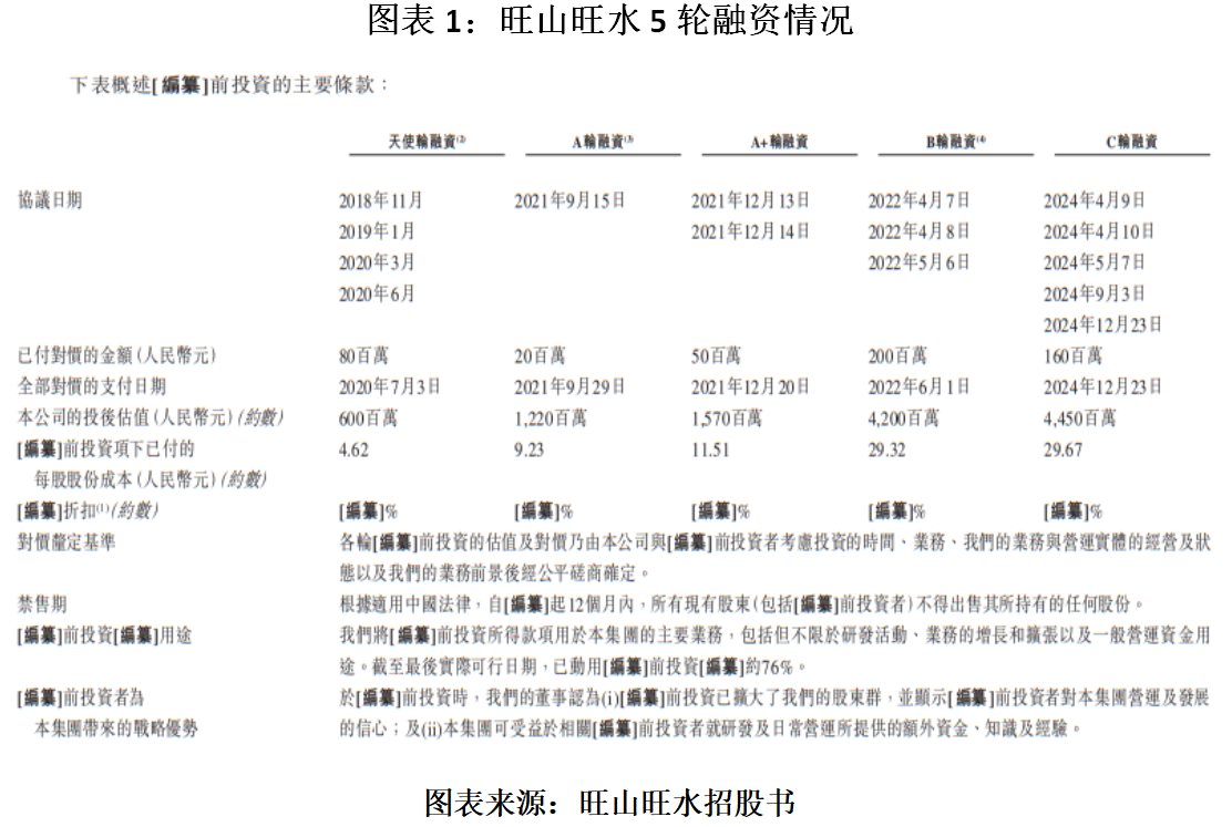 1.投后估值达44.5亿元,曾签对赌协议。截至2024年5月,旺山旺水已进行了5轮融资,累计获得5.1亿元资金,投后估值达到44.5亿元。不过,旺山旺水曾与一名投资者签署对赌协议,该协议于2024年12月终止。