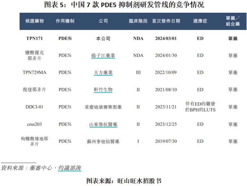 旺山旺水的TPN171则是一款用于ED(勃起功能障碍)治疗的PDE5抑制剂。截至最后实际可行日期,中国有7款处于开发阶段用于ED治疗的PDE5抑制剂,TPN171为提交NDA(新药上市申请)的两款候选产品之一。