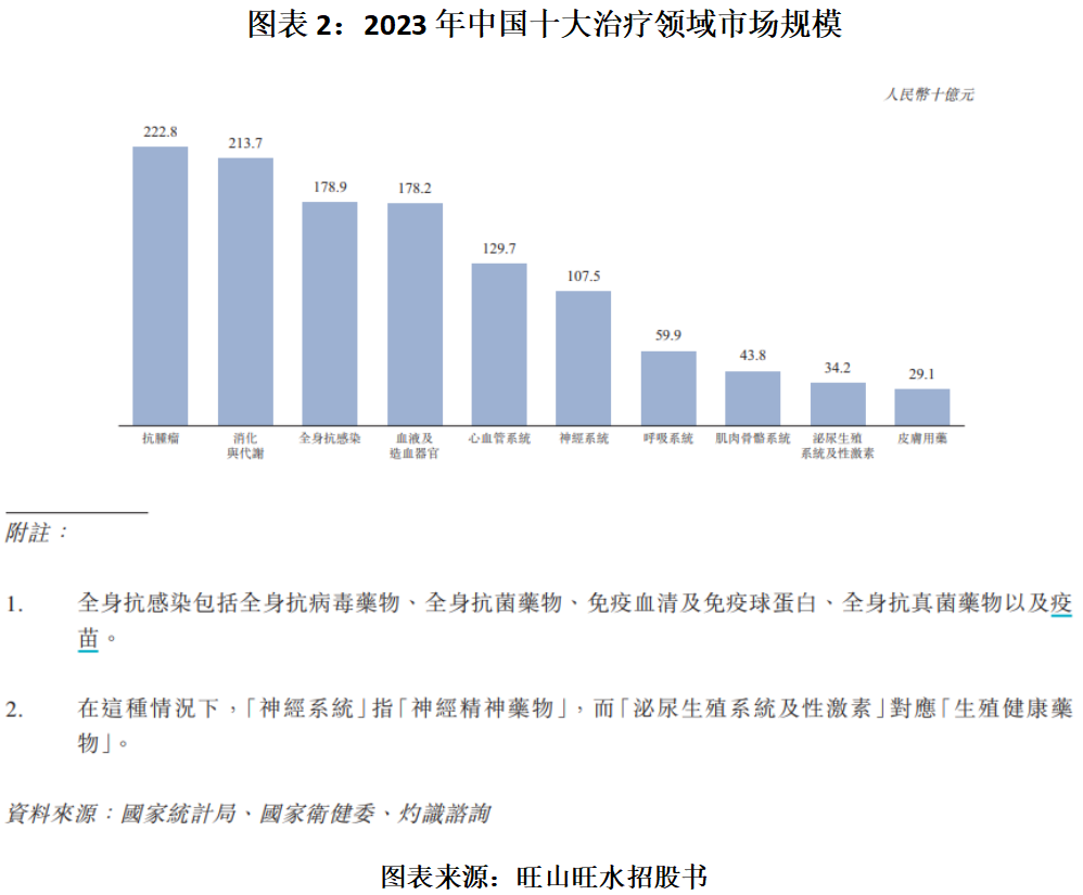 抗病毒、神经精神及生殖健康药物为中国医药行业的重要部分。根据灼识咨询的资料,按销售额计算,全身抗感染药物市场规模在中国十大治疗领域中位列第三,其中,抗病毒药物占据重要份额;神经精神药物位列第六,相比之下,生殖健康药物市场相对较小。