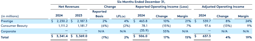 分部门来看,2025财年H1,科蒂高端美容部门(Prestige)与大众消费美容部门(Consumer Beauty)的表现则形成了鲜明的对比。期内,前者净收入为163.01亿元,占科蒂销售额的67%,较2023年同期增长2%,按LFL增长了4%;而后者净收入为81.21亿元,收入占比为33.2%,较2023年同期下降了6%,按LFL下降了2%。