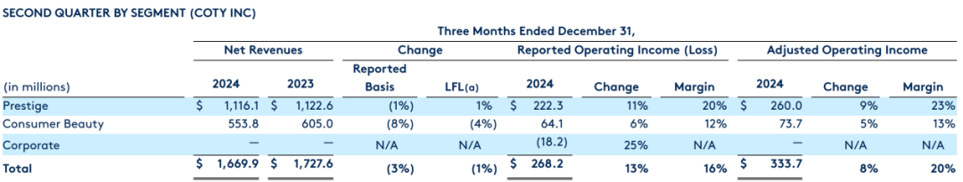 其中,在2025财年Q2期内,科蒂高端美容部门与大众消费美容部门则均录得业绩下滑。具体来看,高端美容部门净收入为81.52亿元,同比下降1%,按LFL计算增长1%。大众消费美容部门的净收入则为40.45亿元,同比下降8%,按LFL计算,下降幅度为4%。