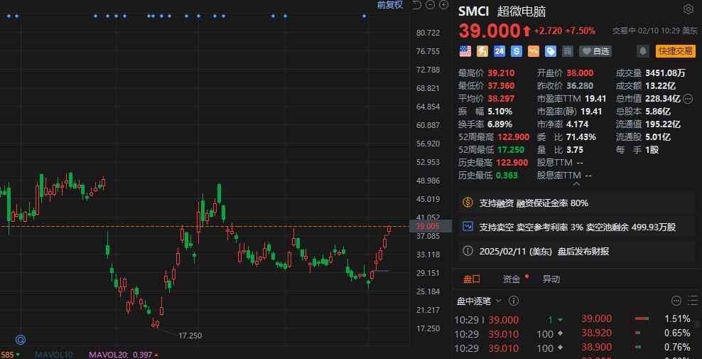 超微电脑大幅拉升涨超7%,5日连涨高达45%。消息上,该公司将于美东时间2月11日盘后公布其2025年第一财季财报。分析师预计,非公认会计准则每股收益(EPS)为0.75美元,比去年同期的0.34美元增长了一倍多。预计收入约为61.26亿美元,与2023年第一季度的21.2亿美元相比,将实现近三倍增长。