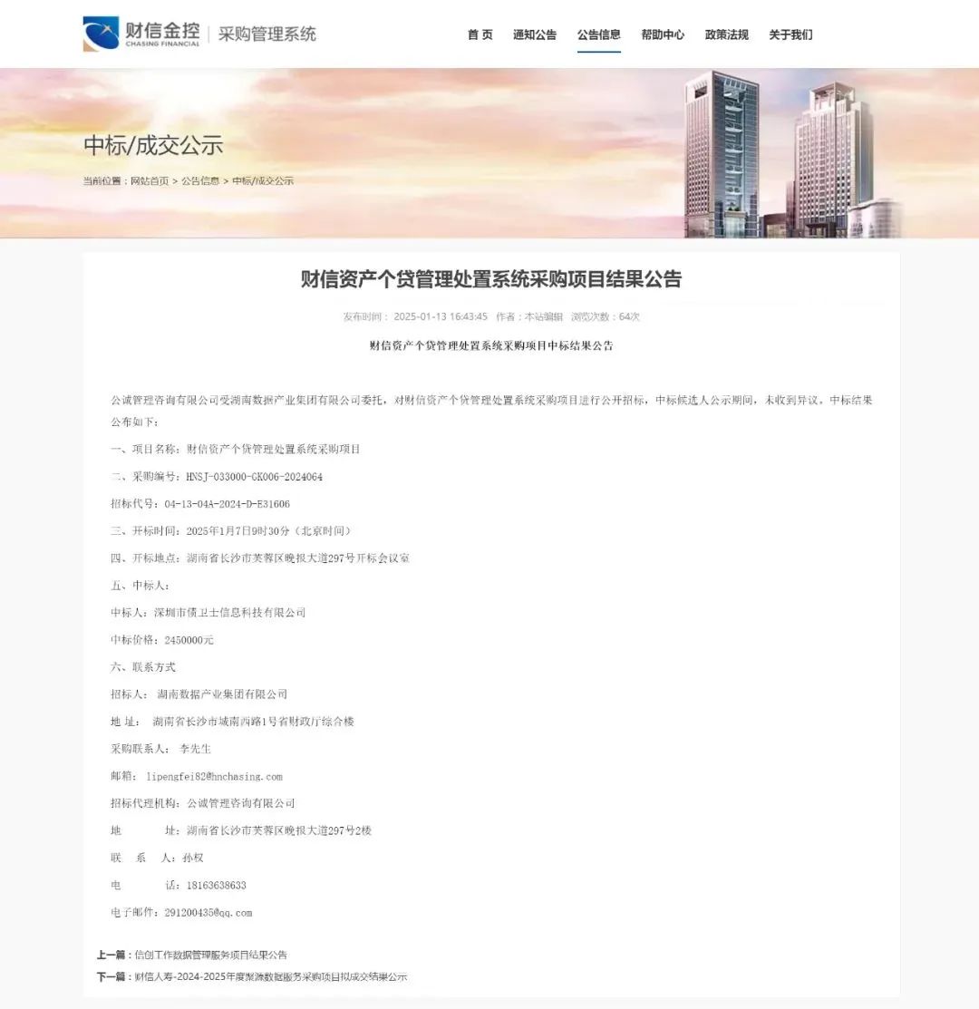 据官网报道湖南财信金融控股集团有限公司个贷管理处置系统项目公开招标,M+科技成功中标。M+科技、债卫士科技同属一家主体公司,据悉M+科技目前已累计合作十几家持牌AMC,二级市场民间AMC30多家。银行和消费金融公司、小贷公司、律所、调解中心等中小型处置公司累计2000 多家。