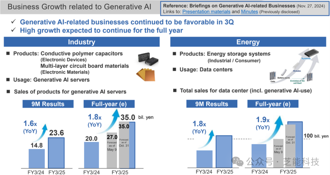 ◎ 在工业业务中,用于生成式 AI 服务器的导电聚合物电容器和多层电路板材料等产品销售额大幅增长;
