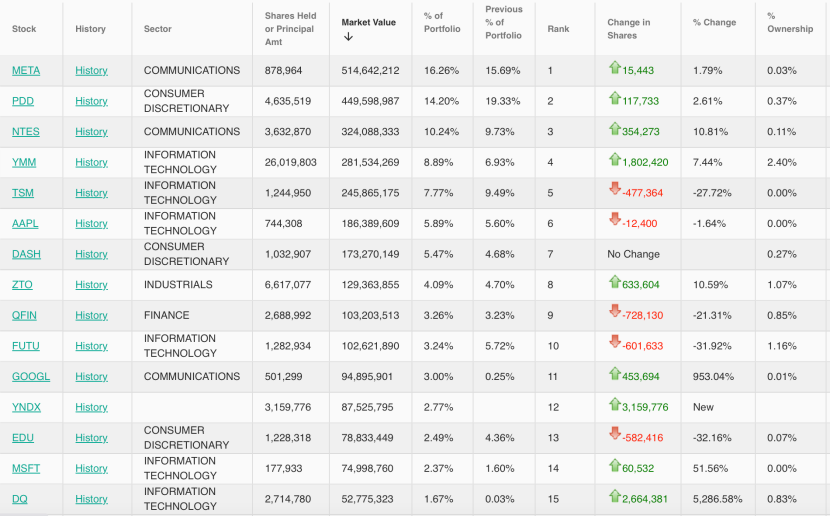 2月15日电,高瓴旗下独立的、专注于二级市场投资的基金管理平台HHLR Advisors公布了截至2024年四季度末的美股持仓数据。