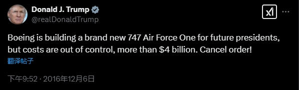 △2016年12月6日,特朗普发布的贴文截图于是2018年,在第一个任期内,经过特朗普的亲自“砍价”,白宫与波音公司达成39亿美元的“空军一号”2.0项目合同。