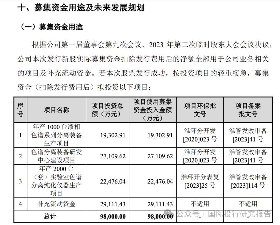 7 、公司目前的销售和募资产能有差距。IPO问询表示,关于募集资金投向 根据首轮问询回复:(1)2021 年-2023 年,发行人生产级液相色谱系统销 量分别为 254 台、383 台、439 台;2023 年,发行人实验室液相色谱产品销售数 量约 500 台;(2)本次募投拟新增 1000 台液相色谱系列分离装备产能,以及 2000 台(套)实验室色谱分离纯化仪器产能。更严重的是,公司的存货账面价值分别为 38,668.10 万元、50,819.61 万元、 43,092.20 万元和 41,633.59 万元。而公司的营业收入不到 5 亿。而募资 5.98 亿也超过了年营业额。