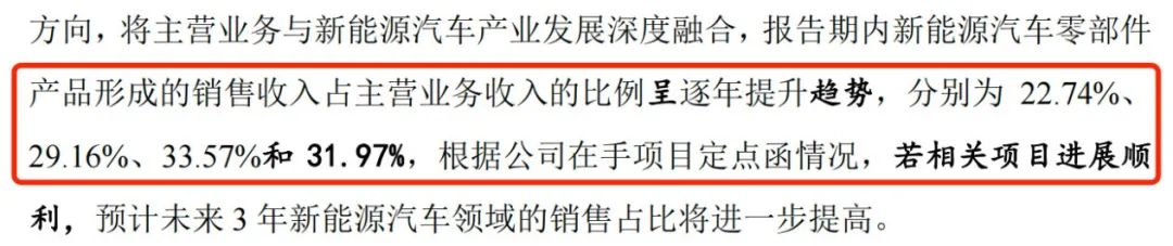 不过,新能源汽车客户贡献的收入还不算多。报告期内,公司新能源汽车零部件产品形成的销售收入占主营业务收入的比例分别为22.74%、29.16%、33.57%和31.97%。