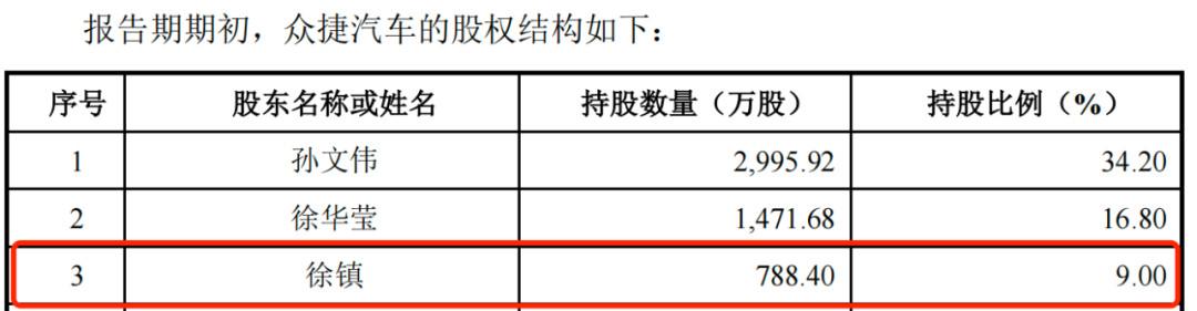 目前,孙洁晓已经不再是众捷汽车股东。徐镇是公司的第三大股东,持有众捷汽车788.40万股,持股比例为9%,但并未在公司任职。