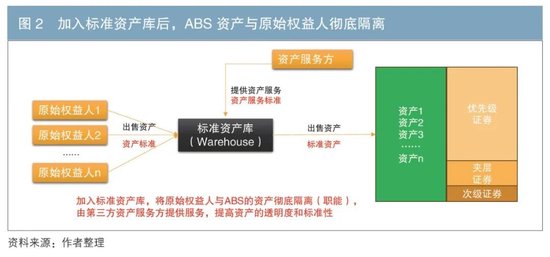 建立标准资产库,以强信用主体作为标准资产库的载体,同时引入专业的第三方资产服务机构,有助于解决证券化产品的主体信用被过度关注与依赖的问题,将关注点转为资产特征。只有弱化证券化产品的主体依赖,才能充分体现出基础资产数据的价值,并基于基础资产风险和收益特征设计出更加合理的偿付结构和触发事件,有效隔离不同种类基础资产的风险,最终得到高度标准化的产品。