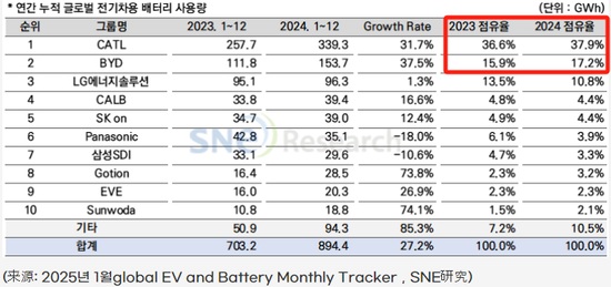韩国电池和能源研究公司SNE Research数据显示,2024年,宁德时代全球动力电池使用量的市占率创新高,达37.9%。