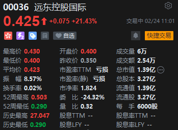2月24日消息,远东控股国际盘中股价直线拉升,涨超20%,现报0.425港元。