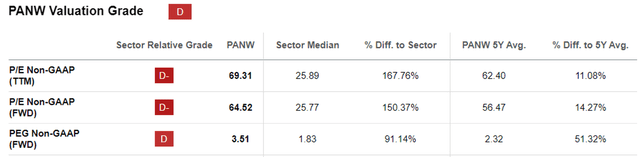 增长放缓也是Palo Alto估值过高的原因,其 FWD P/E 非 GAAP 估值为 64.52 倍,FWD PEG 非 GAAP 比率为 3.51 倍,均大幅高于 1 年平均值 55.60 倍/2.0 倍、5 年平均值 56.47 倍/2.32 倍和 3 年前平均值 42.24 倍/0.87 倍。