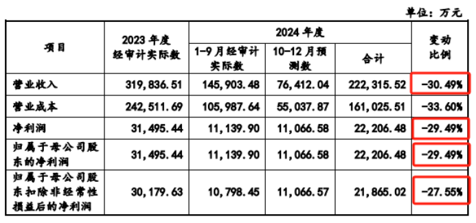 因下游领域扩产节奏放缓,宏工科技营业收入出现下滑。宏工科技在2024年12月10日签署的注册稿中预计,其2024年营业收入为22.23亿元,同比下降30.49%;其归母净利润为2.22亿元,同比下降29.49%。