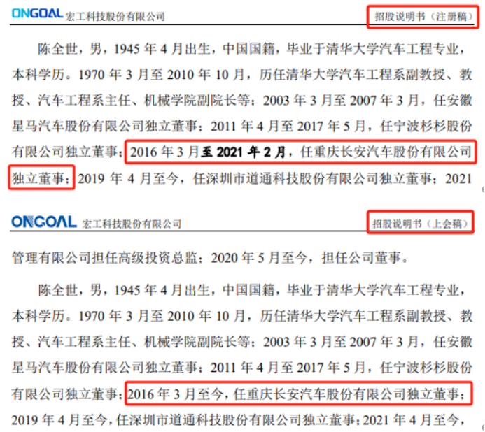 注册稿显示,宏工科技独立董事陈全世2016年3月至2021年2月,任重庆长安汽车股份有限公司(下称“长安汽车”)独立董事。