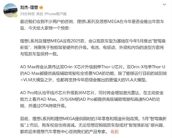 新浪科技讯 2月28日上午消息,理想汽车副总裁刘杰今日在微博透露,理想L系列及理想MEGA没有2025款,会以现款车型为基础在今年5月推出“智驾焕新版”,将聚焦于智能驾驶硬件的升级。电池、电驱动、外观和内饰的造型方面将与现款车型保持一致。