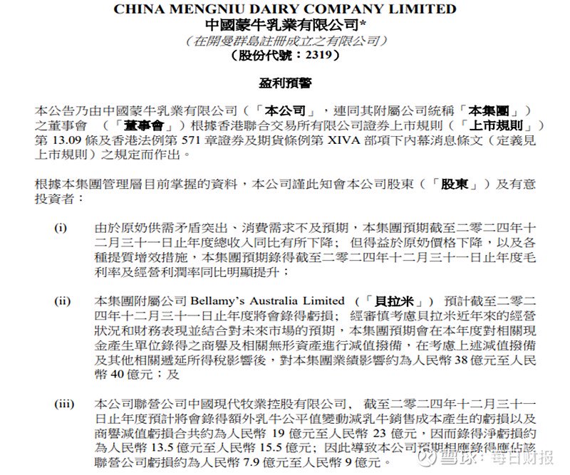 蒙牛乳业预计贝拉米在2024年度将会录得亏损。其称,预期会在2024年度对相关现金产生单位录得的商誉及相关无形资产进行减值拨备,预计对蒙牛集团业绩影响约为38亿元至40亿元。2021年、2022年蒙牛已先后计提6.2亿元和7.42亿元的商誉减值。