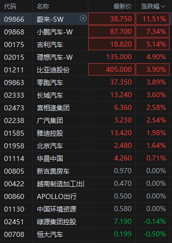 港股汽车股强势上拉蔚来涨超11%