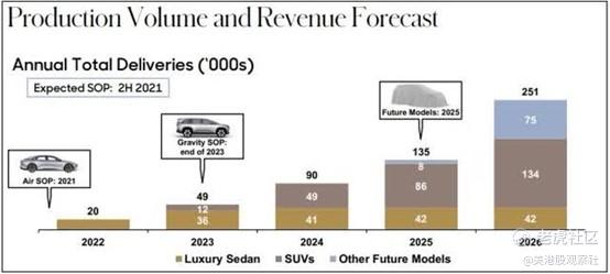 随着Gravity在2024年底开始生产,人们原本预计Lucid今年将实现大幅增长。在去年仅生产了略高于9000辆汽车后,公司目前预计今年将生产2万辆。尽管这一预测比去年翻了一番,但我们不能忘记Lucid在上市时的长期雄心壮志,如下所示。
