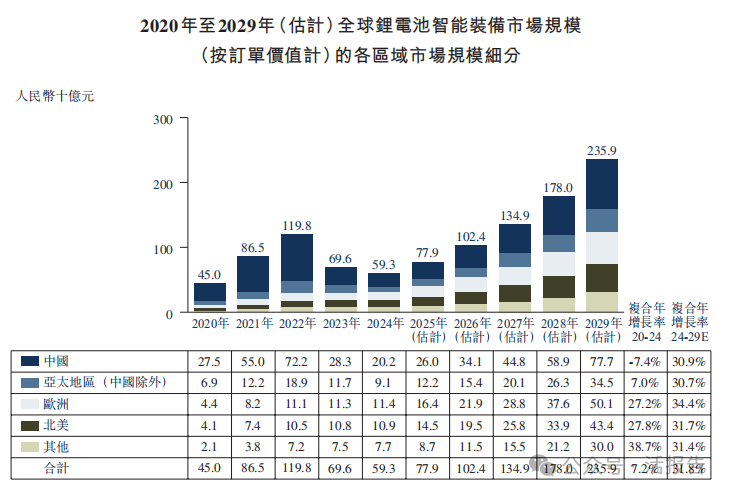 全球锂电池智能装备规模预计将在2029年增至人民币2,359亿元,未来五年的复合年增长率为31.8%。