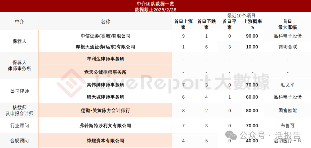 据LiveReport大数据统计,先导智能中介团队共9家,其中保荐人2家,历史表现参差不齐;公司律师共计2家,历史数据表现中规中矩。总体来说,这个组合过去表现可圈可点。