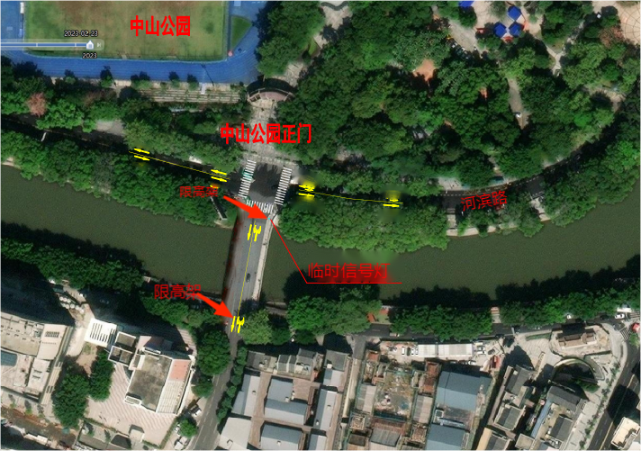 增设临时信号灯及非机动车护栏,河滨路取消部分停车位,并在中山桥两端设置限高架(高度3.5米),禁止超高车辆通行。