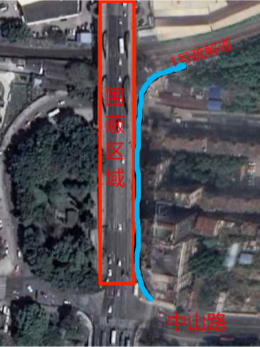 左图为卫星图路线图;右图为道路实景3、中山公园正门、文沙桥南辅道等重要节点增设护栏,保障行人安全。
