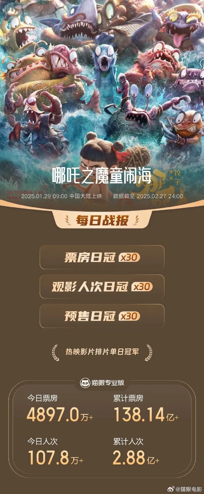 据猫眼专业版数据,截至2月27日,电影《哪咤之魔童闹海》上映30天,连续30天获得单日票房冠军。(来源:人民日报)