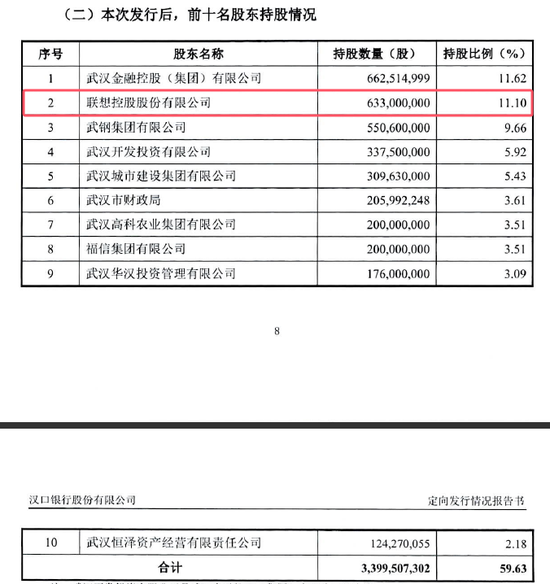 值得注意的是,在本次新增股份发行之后,汉口银行前十大股东持股情况也随之发生变更。原第三大股东武汉金控集团持股比例由9.78%增至11.62%,升至第一;原第一大股东联想控股持股比例由13.11%稀释至11.10%,退至第二。