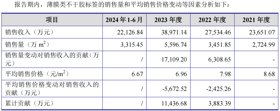 期内江天科技主要产品单价呈下滑趋势。其中,薄膜类不干胶标签2023年价格变动幅度为-12.71%,报告期各期单价分别为8.68元/平方米、7.98元/平方米、6.96元/平方米、6.67元/平方米;纸张类不干胶标签各期分别为8.45元/平方米、8.56元/平方米、8元/平方米、7.64元/平方米。