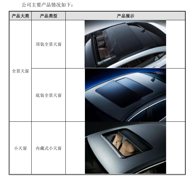 公司的主要产品包括全景天窗和小天窗。其中,全景天窗分为顶装全景天窗和底装全景天窗。顶装全景天窗是从车辆外部上方向车辆顶部进行天窗装配的产品,而底装全景天窗是从车辆室内部向车辆顶部进行天窗装配的产品。