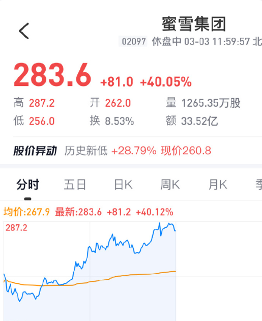 上市当日,蜜雪集团(HK.02097)开盘价为262港元/股,截至今日上午,蜜雪集团报283.6港元,涨幅40.05%,总市值达到1069.3亿港元。