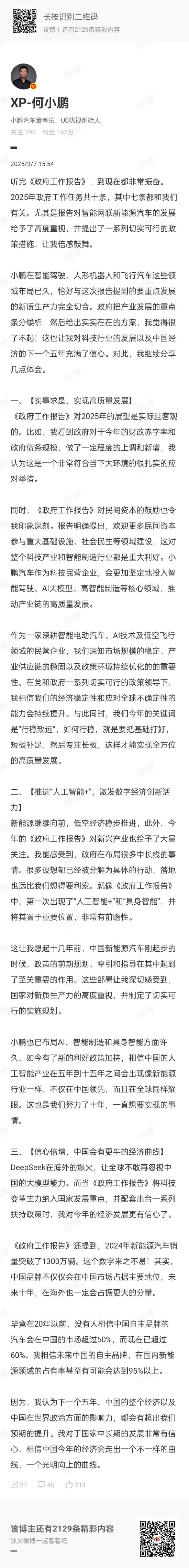新浪科技讯 3月7日下午消息,小鹏汽车董事长何小鹏表示,“听完《政府工作报告》,到现在都非常振奋。2025年政府工作任务共十条,其中七条都和我们有关。尤其是报告对智能网联新能源汽车的发展给予了高度重视,并提出了一系列切实可行的政策措施,让我倍感鼓舞。”他表示,对科技行业的发展以及中国经济的下一个五年充满了信心。