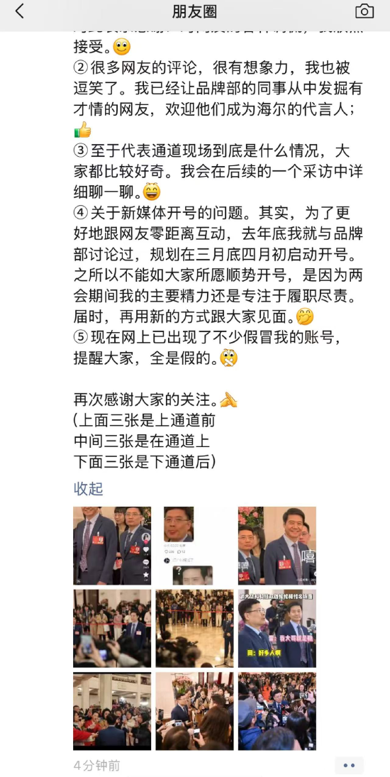 他还谈到,和雷军一起走两会代表通道,引发了网友的广泛关注,自己的表情包也成了网络热梗。“很多朋友私信给我,有的是祝贺我被雷总带火,有的是同情我无辜躺枪被调侃,还有的朋友劝我赶紧开号。因为信息太多,我就不一一回复了,统一发个朋友圈,感谢大家的关心和支持!”