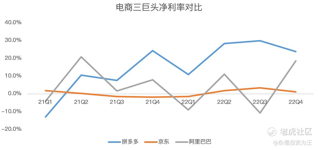 除了净利率绝对数上的超越,盈利质量上拼多多也更胜一筹,众所周知,互联网公司在2022年业绩不佳之后开启疯狂裁员和节省开支模式,反应到财务数据上,如销售费用,京东和阿里巴巴四季度同比增速分别为-10.3%和-16.6%,而拼多多四季度营销费用同比大增56%: