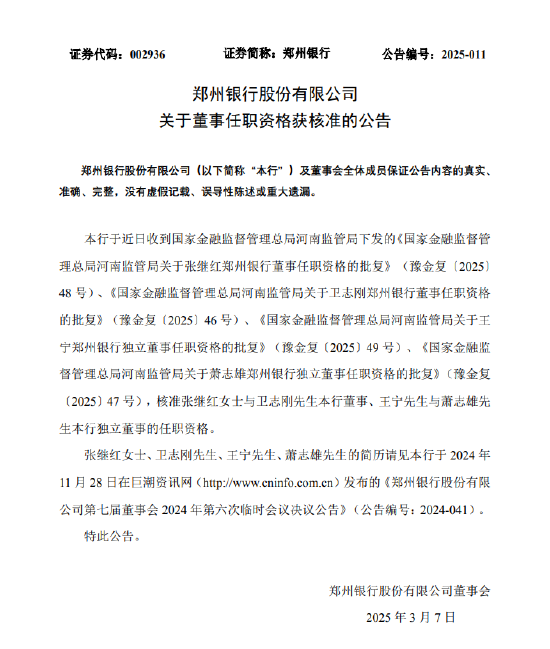 3月6日金融一线消息,郑州银行发布公告称,近日收到国家金融监督管理总局河南监管局下发的批复,核准张继红与卫志刚董事、王宁与萧志雄独立董事的任职资格。