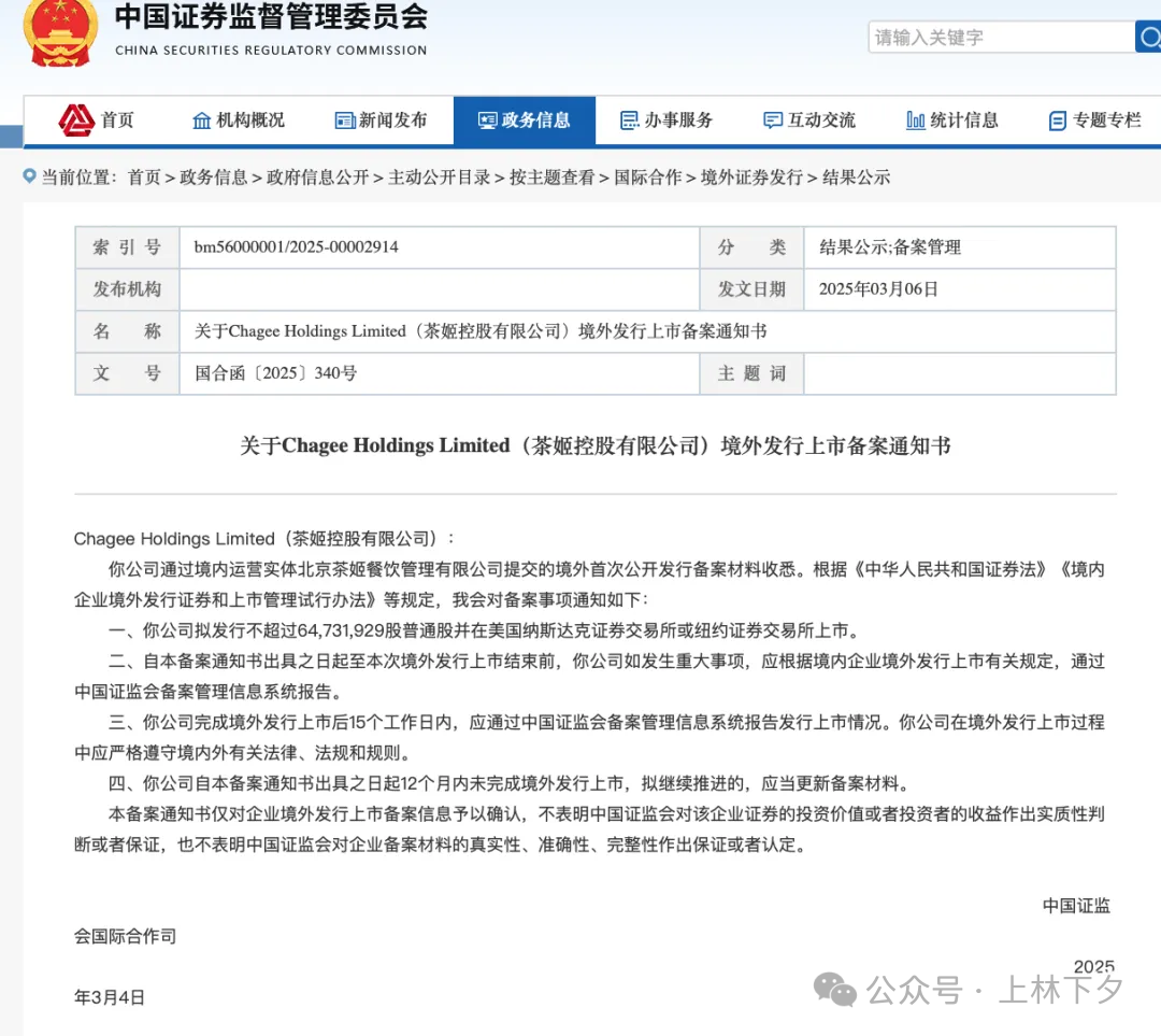 3月6日,中国证监会国际合作司披露了《关于Chagee Holdings Limited(茶姬控股有限公司)境外发行上市备案通知书》。