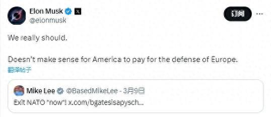 马斯克随后转发了这则贴文并写道:“我们真的应该这样做。美国为欧洲的防务买单是没有意义的。”