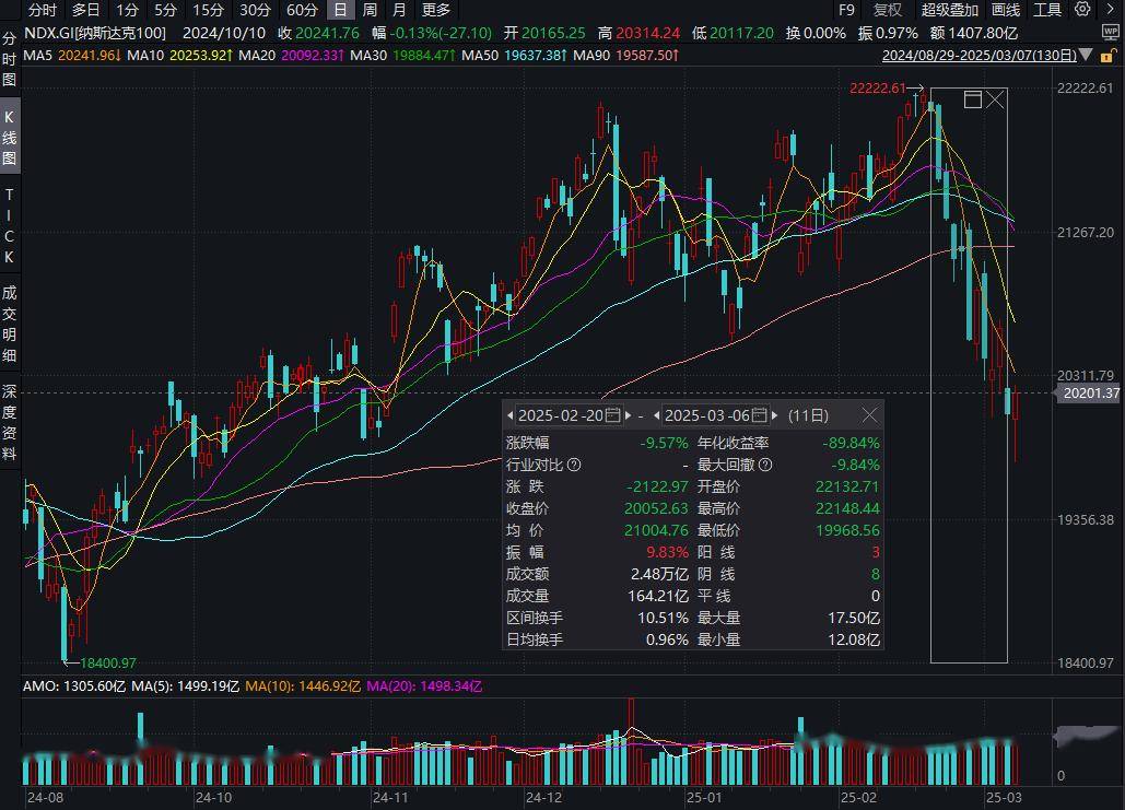 最近纳指的“深度调整”让全球投资者捏了把汗。自2月20日至3月6日,短端11个交易日跌近10%。曾经封神的“科技风向标”,如今却像中年危机的华尔街精英——高估值、高杠杆、高期待,但增长动能明显放缓。