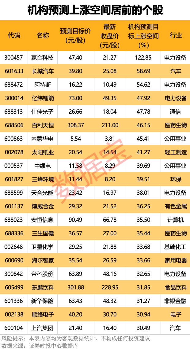 本周机构评级的个股中,21股最新收盘价较机构预测目标价上涨空间超30%,其中赢合科技(维权)上涨空间超120%。