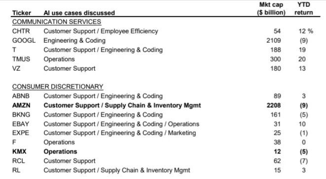 高盛重点介绍了一组第四阶段的早期AI采用者(图表5),它们都在上一季度业绩电话会上证实获得了生产率提升的切实好处。具体应用场景包括客户服务、代码编写与工程设计和库存与供应链管理。既在早期AI采用者名单上又在高盛编制的长期AI第四阶段股票篮子里的股票有亚马逊(AMZN)、高知特(CTSH)、艾昆纬(IQV)、车美仕(KMX)和沃尔玛(WMT)。