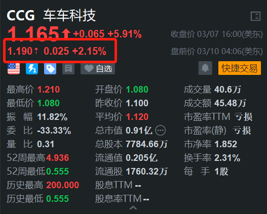 中国领先的车险技术平台车车科技(CCG.US)盘前涨2.15%。消息上,近期多家研究机构曾纷纷看涨车车科技。华升证券给出车车科技“买入”评级,目标价3.76美元。其分析认为,随着合作客户持续拓展和新能源车渗透率提升,车车科技2024-2026年收入将达33.9亿、35.6亿、38.1亿元,毛利率持续改善。投行Maxim Group分析师Allen Klee同样给出“买入”评级,目标价2.5美元。(格隆汇)