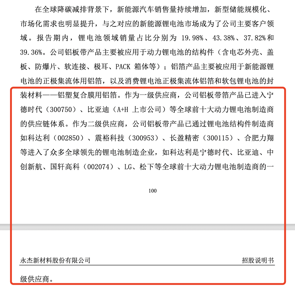 作为二级供应商,公司铝板带产品已通过锂电池结构件制造商 如科达利、震裕科技、长盈精密、合肥力翔等进入了众多全球领先的锂电池制造企业,如科达利是宁德时代、比亚迪、中创新航、国轩高科、LG、松下等全球前十大动力锂电池制造商的一级供应商。
